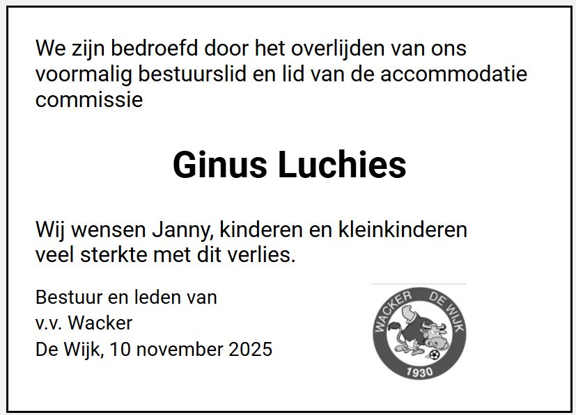 Zondagochtend 9 november is na een korte doch ernstige ziekte overleden onze oud-bestuurslid en mede accommodatie vrijwilliger Ginus Luchies.